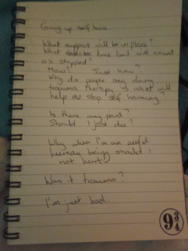In this session we discussed my self harm. Itβs the barrier to me gettting proper trauma therapy. I had a decision to make whether to just carry on self harming and forfeit trauma work or give giving up a go.