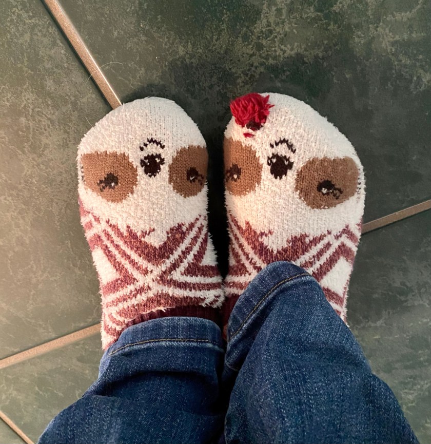 The green tile beneath these classy shoes is slippery as ice when wet, and cool even during summer months. So I wanted something with a little grip and lots of warmth to wear around Doright Manor. Of course I bought them from Walmart. They only cost $4.99, and after a couple of wearings the right foot had a blowout. And I love it!