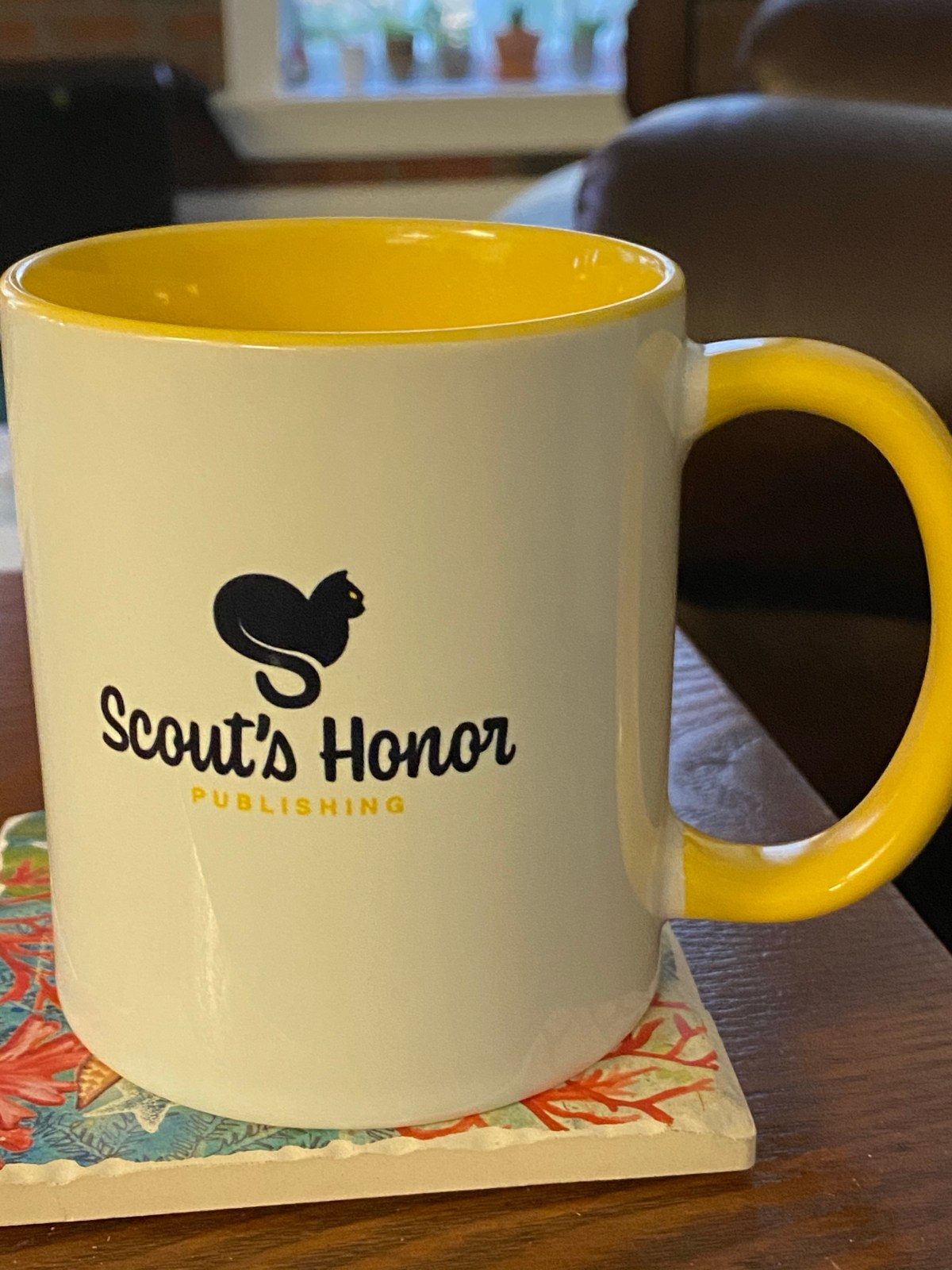 So, I thought, why not have a drawing on my Facebook author page? When the number of reviews reached 40, I’d draw a reviewer’s name at random and give away either a Scout’s Honor coffee mug or a signed copy of Mayhem. Cool, huh?