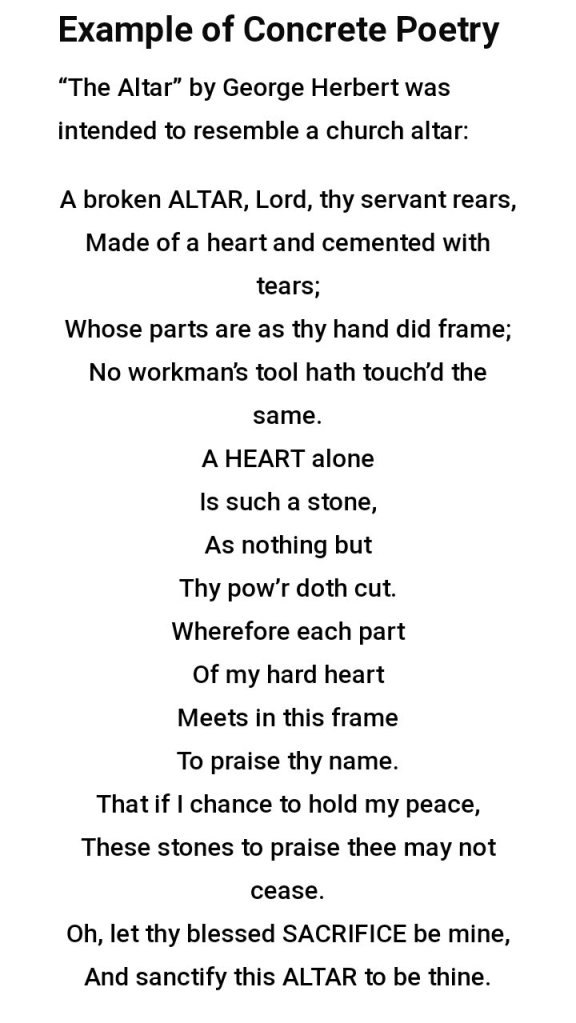 Concrete poetry is an arrangement of linguistic elements in which typographical effect is more important in conveying meaning than verbal significance. This is also called as visionary conveyance of poetry in a distinctive manner. It can have its own vision of description.