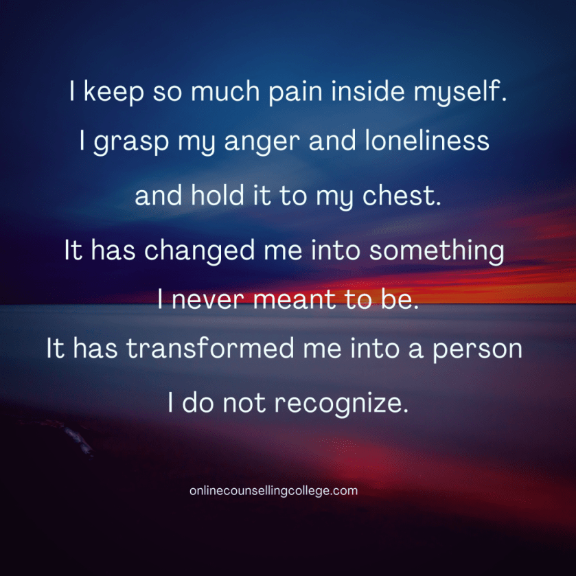 “I keep so much pain inside myself. I grasp my anger and loneliness and hold it in my chest. It has changed me into something I never meant to be. It has transformed me into a person I do not recognize.”
