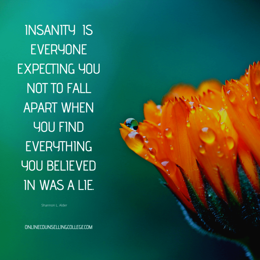 “Insanity is everyone expecting you not to fall apart when you find out everything you believed in was a lie.” – Shannon L. Alder