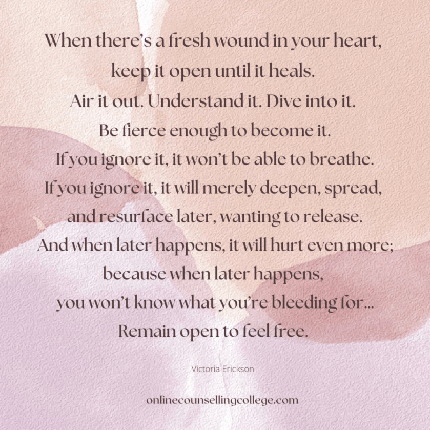 “When there’s a fresh wound in your heart, keep it open until it heals. Air it out. Understand it. Dive into it. Be fierce enough to become it. If you ignore it, it won’t be able to breath. If you ignore it, it will merely deepen, spread, and resurface later, wanting to release. And when later happens, it will hurt even more; because when later happens, you won’t know what you’re bleeding for … Remain open to feel free.”