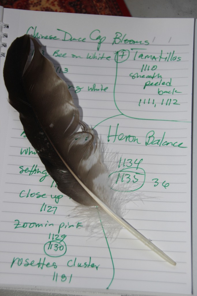 I looked through my “Paper Memories” notebooks for a photo of the feather on the porch until I remembered that I had kept the actual feather. The notebook under the feather is how I keep track of my thousands of photos. (I will share this in a later post.)