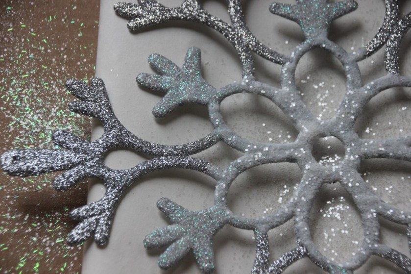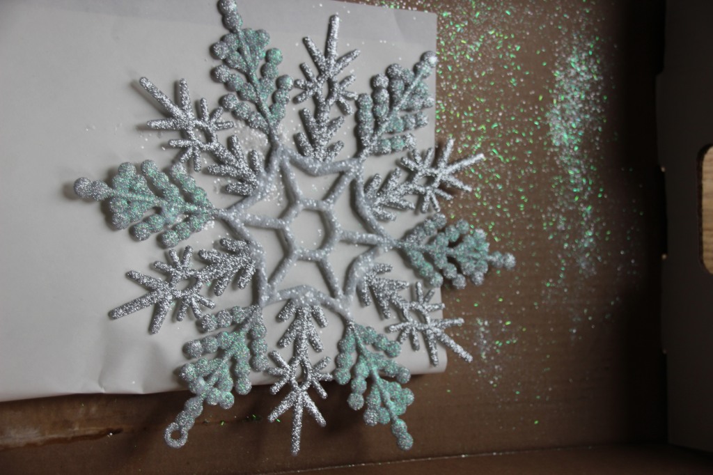 Then I sprinkled different glitter on those sections. Keep the flake contained in a box for this step.